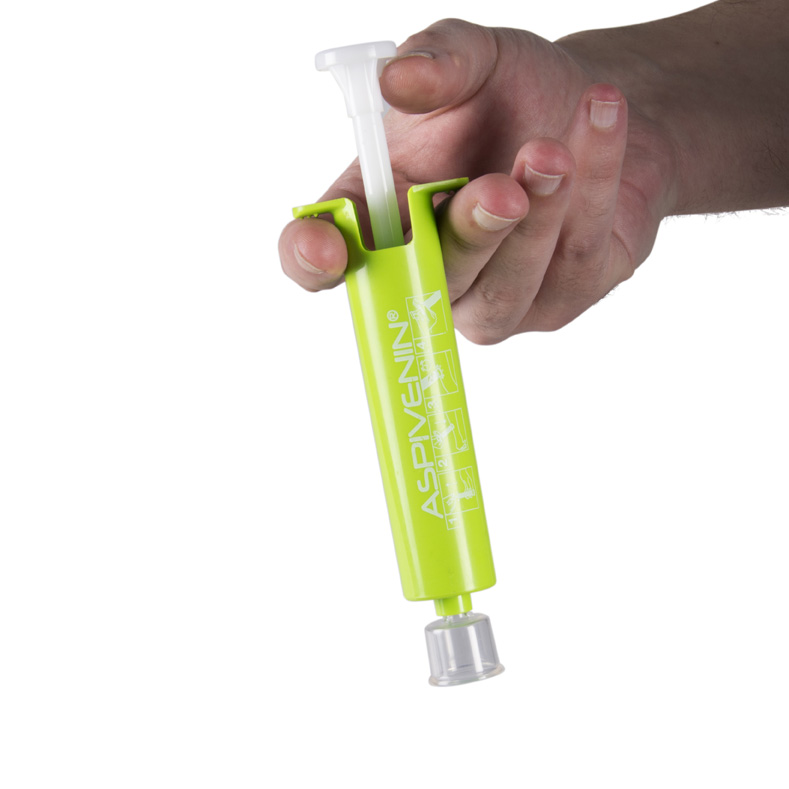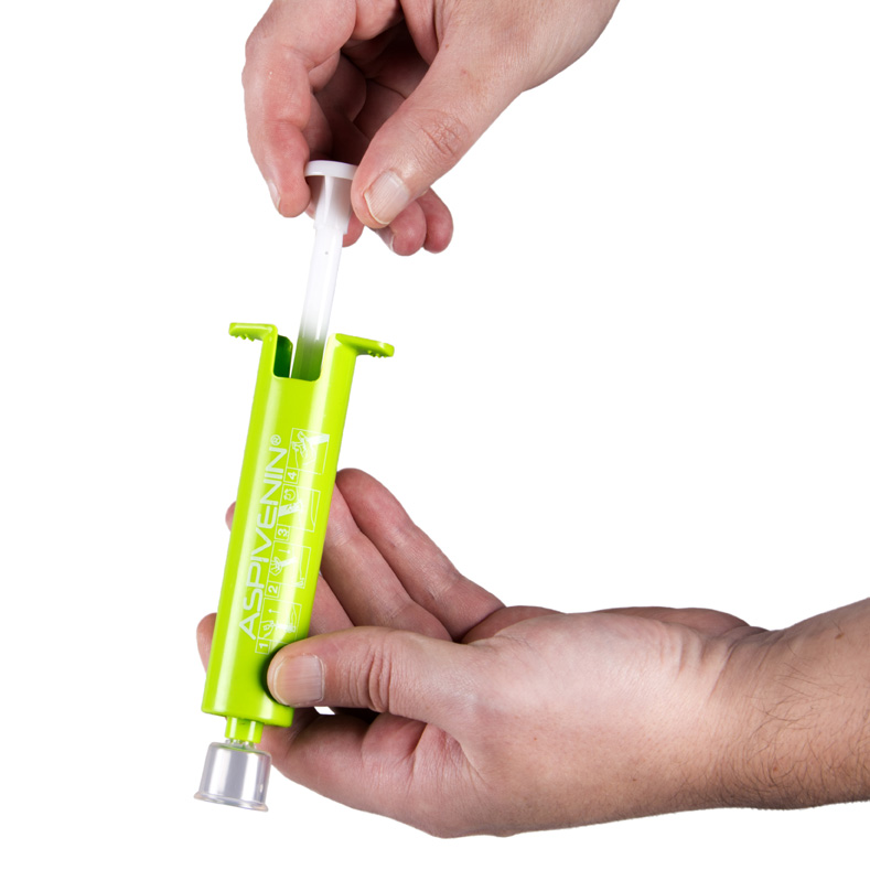 Luego levante el pistón del émbolo con la punta de su pulgar para quitar la bomba ASPIVENIN®. Le recomendamos que manipule su bomba antiveneno antes de usarla consultando las instrucciones. Levantar el pistón para retirar ASPIVENIN®. Limpiar la herida con un antiséptico. Si el dolor no ha desaparecido reanudar desde el segundo paso.